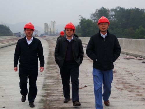 集團公司朱堅和董事長(左一)、李定倫總經(jīng)理(右一)視察永寧河大橋施工現(xiàn)場