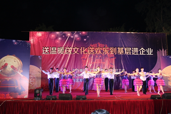 晚上,自治區(qū)總工會(huì)安排了豐富多彩的慰問(wèn)演出。整場(chǎng)演出以“勞動(dòng)托起中國(guó)夢(mèng)”為主題,載歌載舞,奏響勞動(dòng)光榮的時(shí)代主旋律。慰問(wèn)演出在富有壯族文化風(fēng)情的《廣西尼的呀》的舞蹈中拉開(kāi)了序幕,既有《力與美》的高難度雜技表演,又有詼諧幽默、勵(lì)志感人的小品《為愛(ài)加油》,配樂(lè)詩(shī)朗誦《心儀廣西》展示了廣西壯鄉(xiāng)的山好水好前景闊,更有優(yōu)美的舞蹈《魅影》、《工匠精神》等節(jié)目更是歌頌了勞動(dòng)之美。路橋集團(tuán)員工還帶來(lái)配樂(lè)詩(shī)朗誦《萬(wàn)里征程品為本,行穩(wěn)致遠(yuǎn)前景闊》和小品《工地愛(ài)情故事》,展現(xiàn)了路橋職工的風(fēng)采。慰問(wèn)演出在歌舞《不忘初心》中畫(huà)上了圓滿(mǎn)的句號(hào),路橋建設(shè)者們?cè)谶@場(chǎng)文化盛宴中度過(guò)一個(gè)難忘的夜晚。