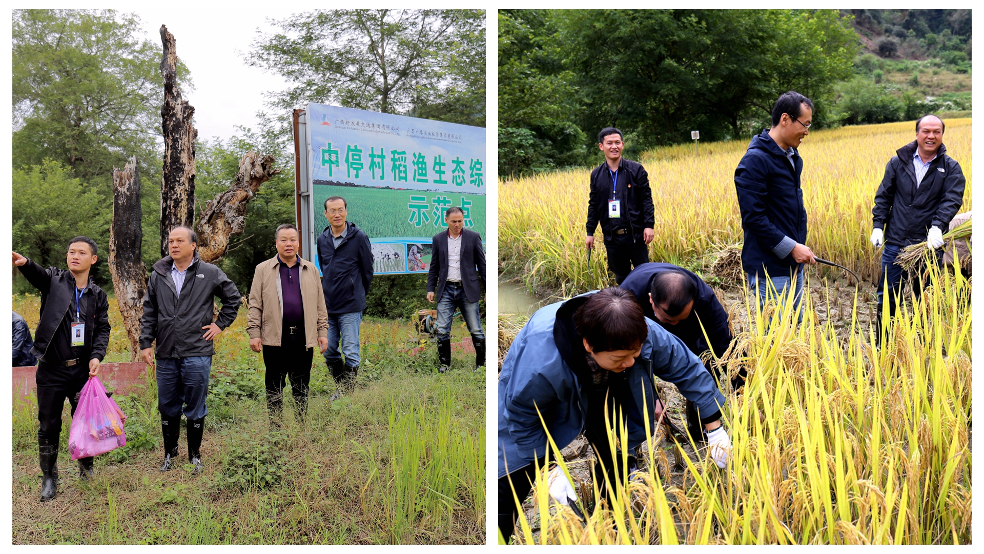 實地察看集團(tuán)公司援助建設(shè)的中停村有機(jī)米產(chǎn)業(yè)(核心)示范區(qū),同村民一起收割稻谷。