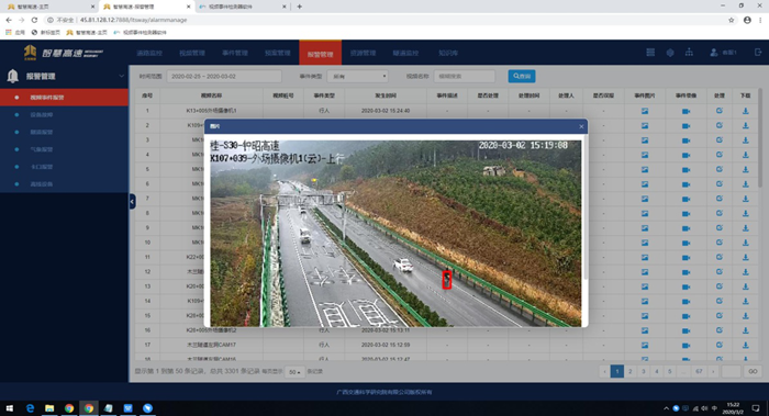 近日,昭平運(yùn)營(yíng)管理中心智慧高速軟件平臺(tái)引入了“人工智能事件檢測(cè)報(bào)警系統(tǒng)”。該系統(tǒng)采用了人工智能深度學(xué)習(xí)技術(shù),在鐘昭高速每2公里一個(gè)監(jiān)控?cái)z像機(jī)的硬件基礎(chǔ)上,能夠?qū)崿F(xiàn)鐘昭高速全線事件檢測(cè)全面覆蓋,快速發(fā)現(xiàn)路上異常情況并發(fā)出警報(bào)。